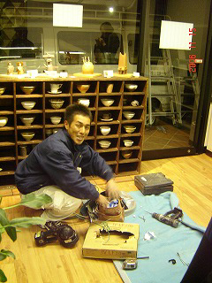 望月電気の社長さんがたまごの器のスポットライトを付けてくれました。 さわやかな人です!!