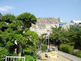 御世話になっております。大阪府の福泉寺 本堂屋根葺き替え工事の様子です。前回までは庫裏の屋根の工事ですが、今回からは本堂屋根工事の新着情報をお知らせいたします。只今平葺きから棟取りに移って行く所です。奈良瓦瓦センターの本葺一体式の2段仕様の飛鳥2号を使用しました。