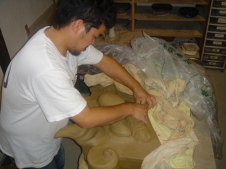 福泉寺の鬼を手掛けた弊社 鬼師 原川圭介 鬼瓦の魅力に取り付かれ鬼師となり10年がたちます。そもそも鬼師を目指すきっかけとなったのは、先代渡辺商店会長、渡邊好夫氏との出会いがからである。原川が会社にプライベートで垣根を作る作業を会長としていた所から、原川の器用さに会長が目をつけ鬼瓦創りに向いていると見込みスカウトされました。