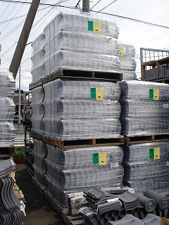 右は梱包予定の瓦、4枚で1束になっている。瓦は1パレット432枚で1枚約3キロある。合計で1.2トンくらいの重さになります。