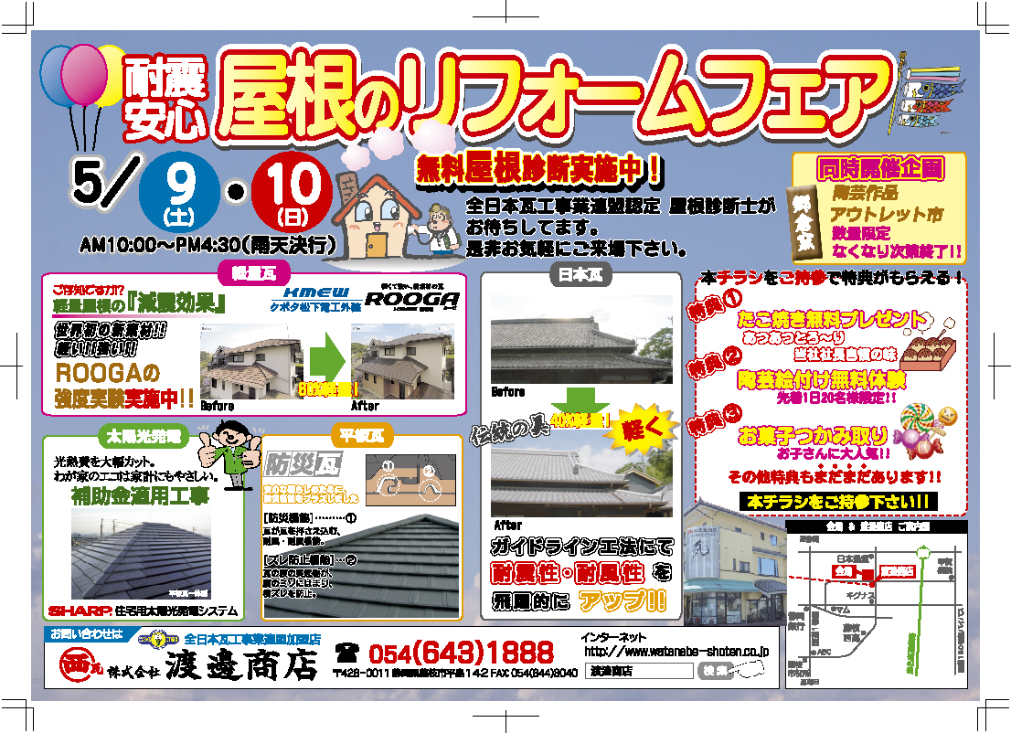 屋根のリフォームフェアを開催いたします。チラシをお持ちくださった方は、素敵なプレゼントを差し上げますよ。 訪問販売などでお困りの方、今なら屋根診断のプロがあなたの家の屋根を無料診断いたします。
