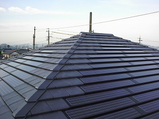 写真はシャープの平板瓦一体型のパネルの写真です。重量 雨漏などを考えると大変お勧めです。 現在一体型太陽光は、ダイワハウス、積水ハウスなどで採用されております。