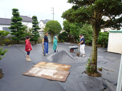 今回は、草が生えてこないようにシートを敷いてある上にシャモットを敷きます。