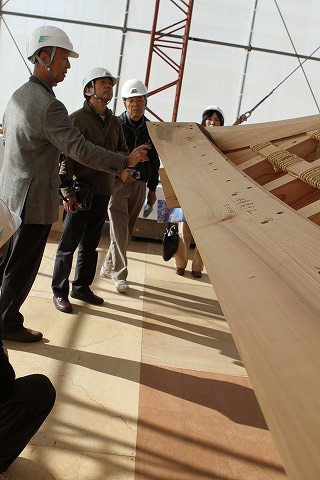 建築文化研究所の八木先生のご説明を受けました。城郭は社寺建築とちがい、桔木(はねぎ)を軒に入れておりません、なぜかとお尋ねしたところ、城郭建築では、すぐに建設できる速攻性が求められる為、社寺建築のような反りを入れた軒をたくさん出す必要が無い城郭建築では、桔木を入れ無い構造になっているとのことでした。