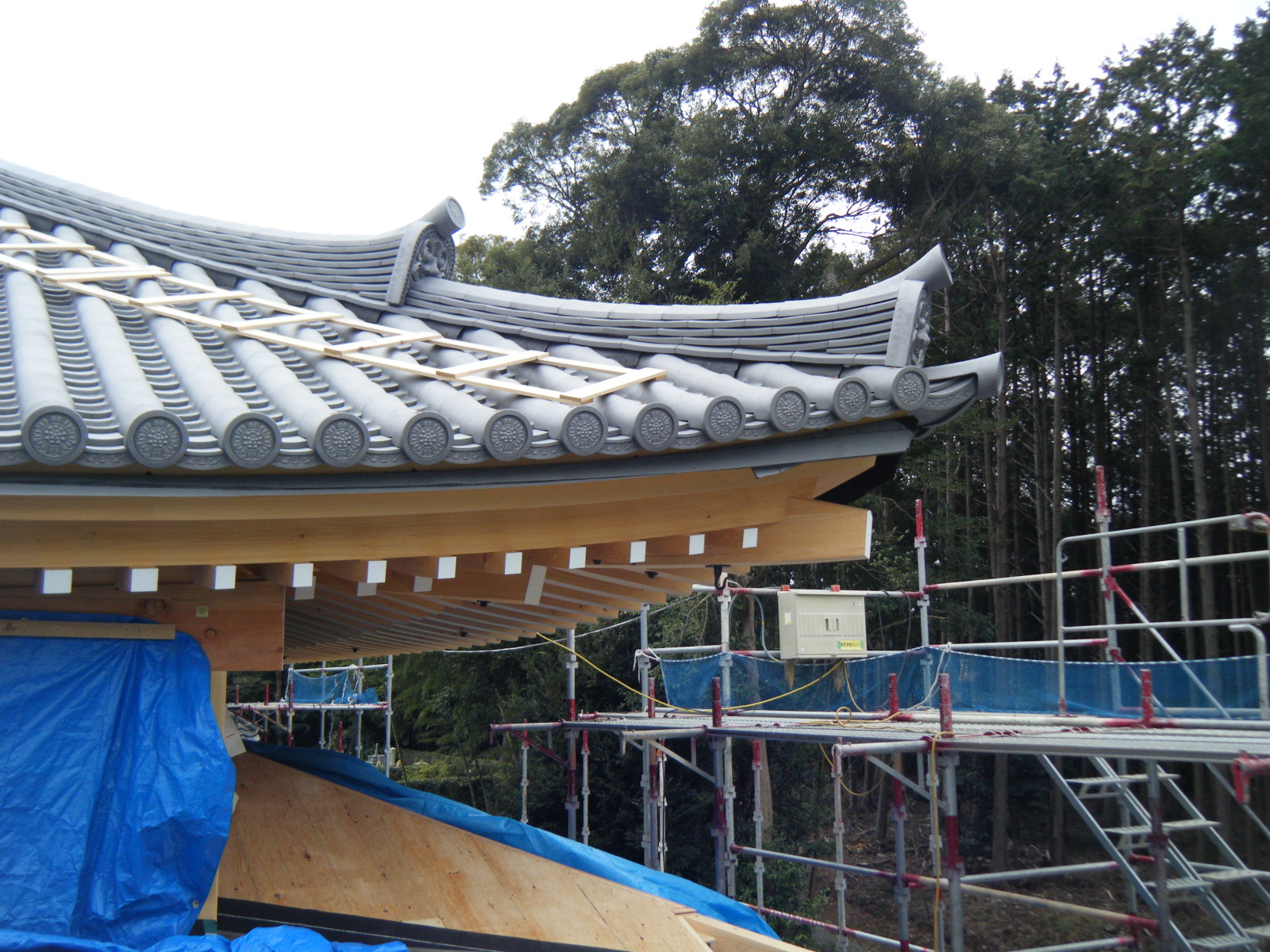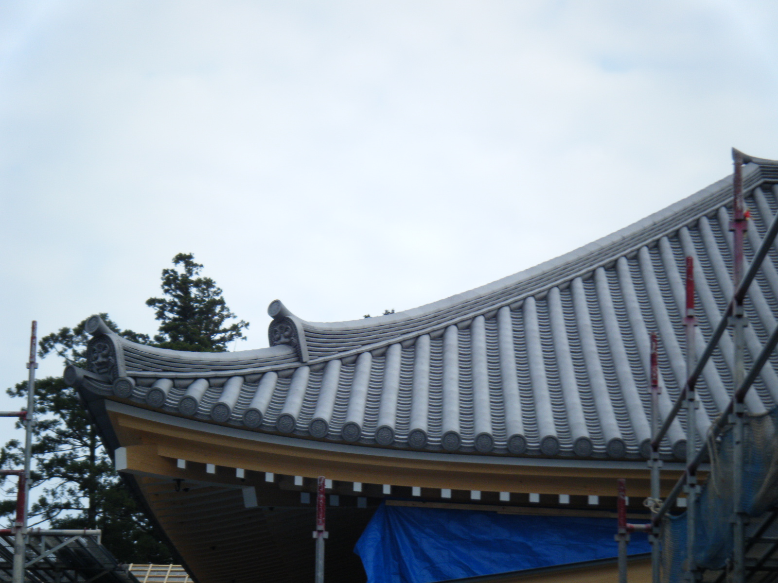 屋根工事が終わりました。寄棟のお寺ですが、隅棟を振れ隅にして大棟を長く見せてる設計になっております。
