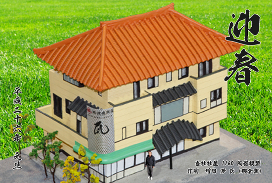 今年の年賀状は、社屋を原寸の60分の1のサイズで、弊社陶芸教室の生徒さんの増田様が作成して下さいました。非常に緻密な作品で、一瞬陶器というのがわかりません。