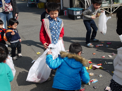 豆だけでなくお菓子もまいたのでより嬉しそうでした。