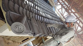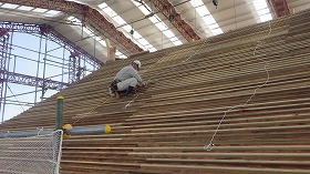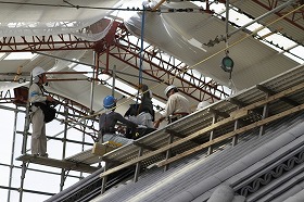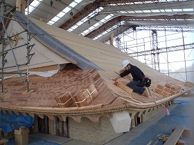 素屋根の棟をとってレッカーで取り付けです。江戸時代はどうやったんでしょか