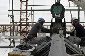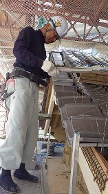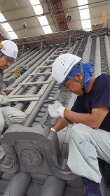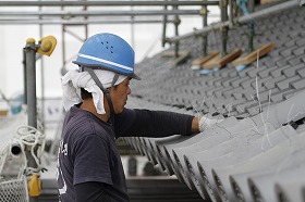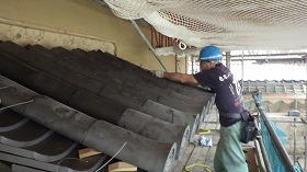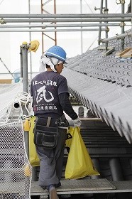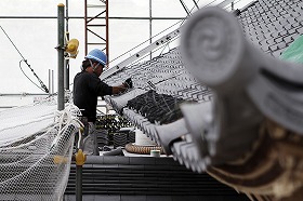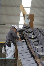 左写真 掛瓦を取り付けをしているアスカ工業(東京都)さんの職長さん