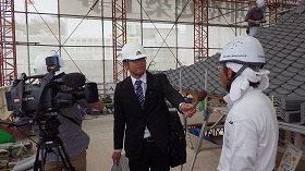 インタビューを受ける組合青年部部長 庇部分の工事(弊社職人 瀬路君)