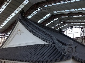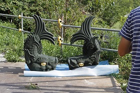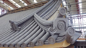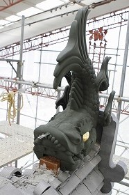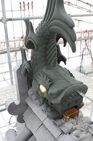 鯱 目には金箔 鯱は阿吽になっています。今回阿が南方向(陽方向)吽を北方向(陰方向)に据えております。