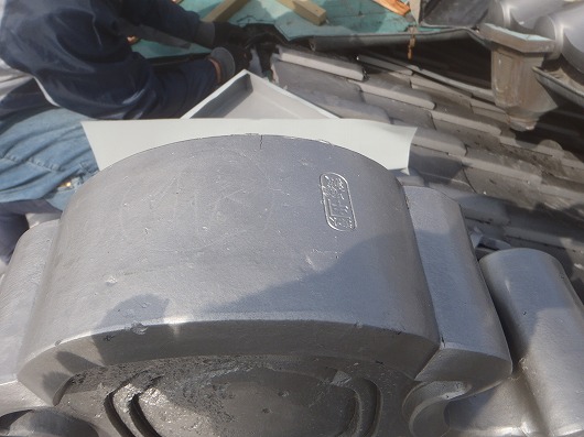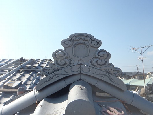 お客様には、今回の葺き替え工事で鬼瓦も新しい物に交換と当初なっておりましたが、大棟の鬼が大変良くできていた為、修復し再利用をお勧めしたところ