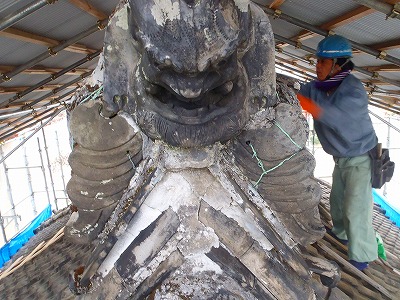 明治時代の瓦への改修葺き替え工事で、檜皮葺き当時の大棟鬼をそのまま使用した為、今回の平成の改修工事まで屋根の上にのっていたとお思われます。その為写真でもわかりますが、刀根丸と鬼足が勾配が違うため漆喰で調整を施してあるのがよくわかります。