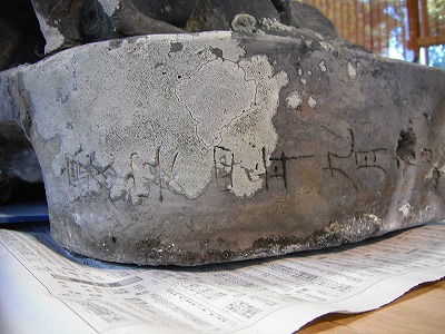 発見された鬼瓦のへら書き 慶安四年となっています。慶安四年ですから1652年です、今から362年前です。江戸幕府徳川家光の時代です。瓦の耐久性はすごいですね、今回縁あって弊社で鬼瓦も復元させていただく事になりました。