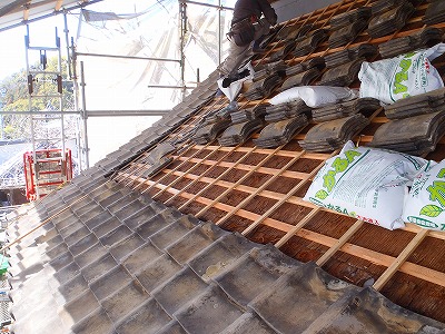 明治時代の瓦への改修葺き替え工事で、檜皮葺き当時の大棟鬼をそのまま使用した為、今回の平成の改修工事まで屋根の上にのっていたとお思われます。その為写真でもわかりますが、刀根丸と鬼足が勾配が違うため漆喰で調整を施してあるのがよくわかります。
