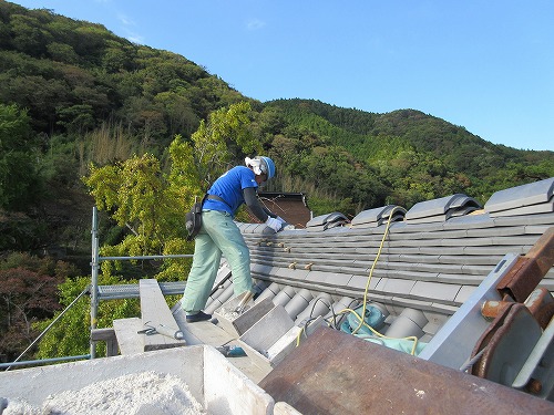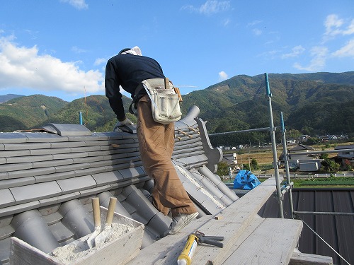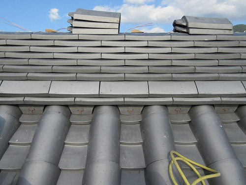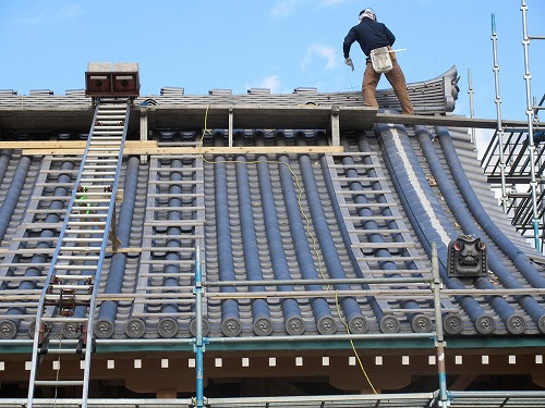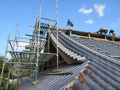 現在大棟の工事中です。瓦は奈良産の飛鳥2号で施工しています。大棟のてりは、弊社独自の計算方法で行ないなんともいえない絶妙なバランスに仕上げます。